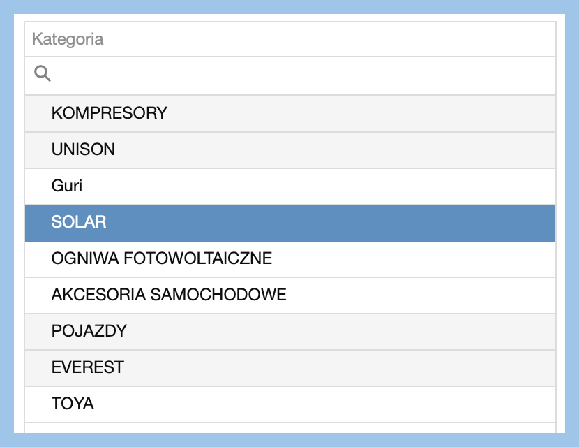 Panel kategorie produktowe składa się z dwóch elementów: paska wyszukiwania produktów oraz drzewka kategorii produktowych. |