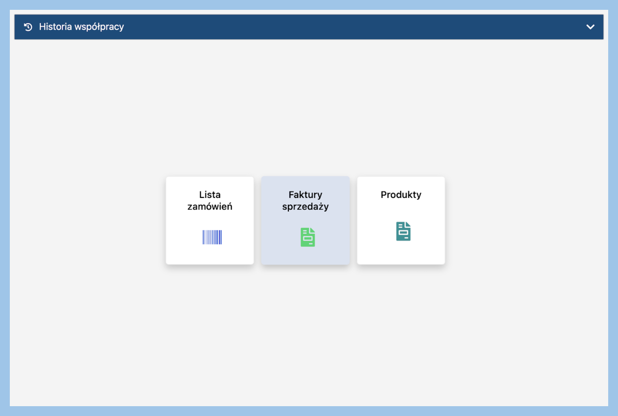 NXMProdukty NXM.InfoBox Historia wspolpracy Sekcja "Historia współpracy" została zaprojektowana w celu umożliwienia efektywnego przeglądania zamówień, faktur oraz produktów, aby zawsze mieć pełny wgląd w bieżące wydarzenia w naszej firmie. Lista zamowien Faktury sprzedazy Produkty