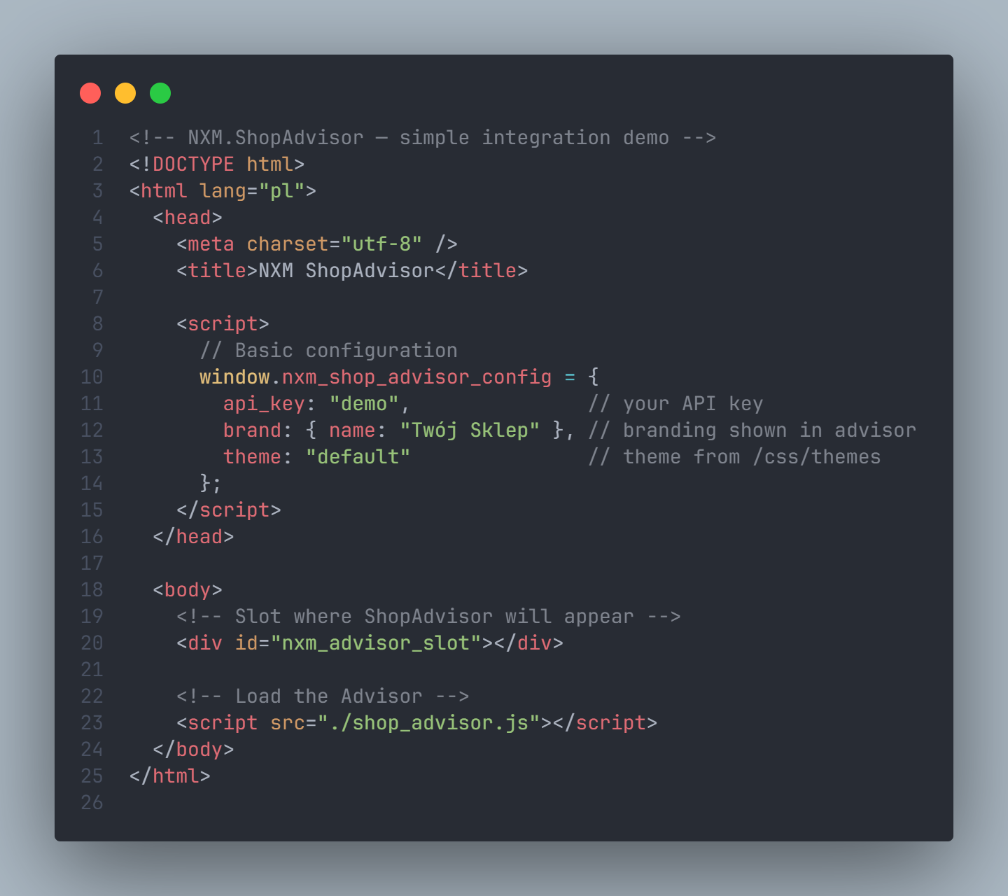 - Dodanie do strony sklepu skryptu JavaScript, który dostarcza funkcjonalność NXM.ShopAdvisor. Najczęściej odbywa się to przez modyfikację szablonów (theme) lub modułów danej platformy e-commerce w panelu administracyjnym.